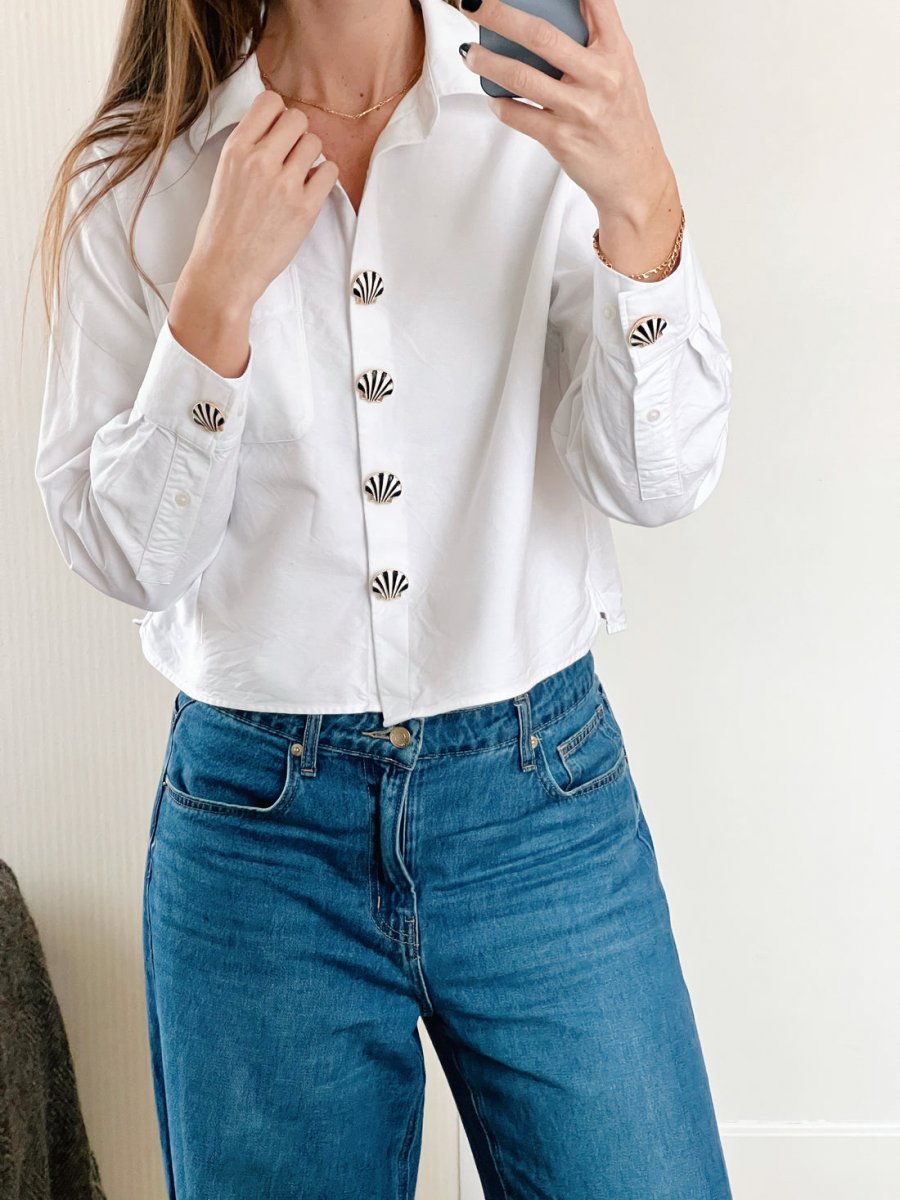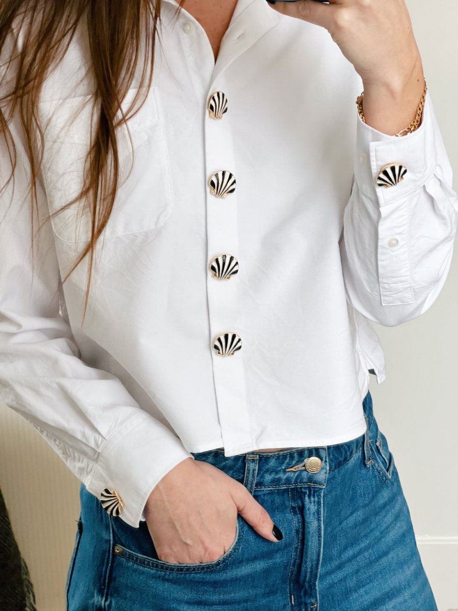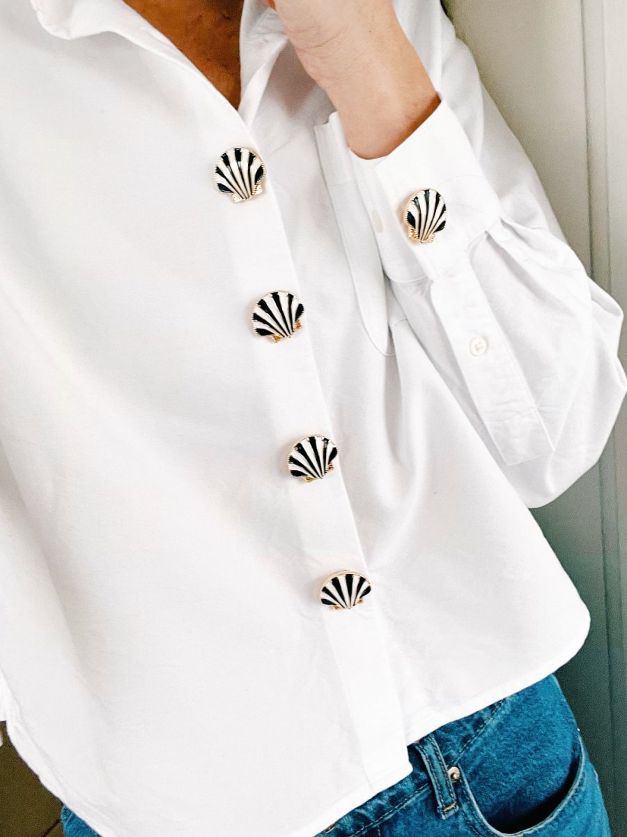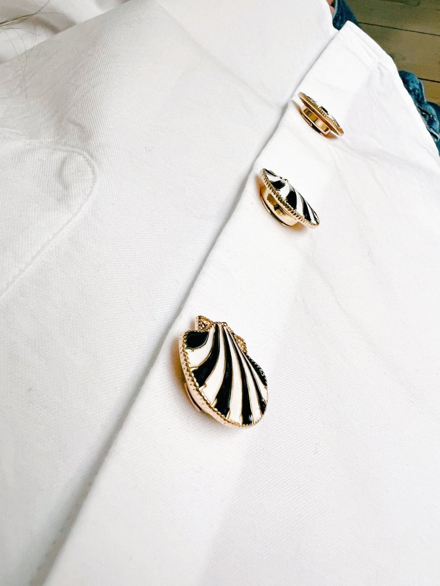 Linn är en snäckformad knappcharm med guldfärgat underrede och svartvita ränder som ger en grafisk, chic kontrast.
