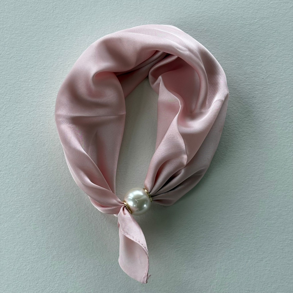 Liten scarf i 100% polyester med smart magnetknäppe med dekorativ pärla. 70x70 cm