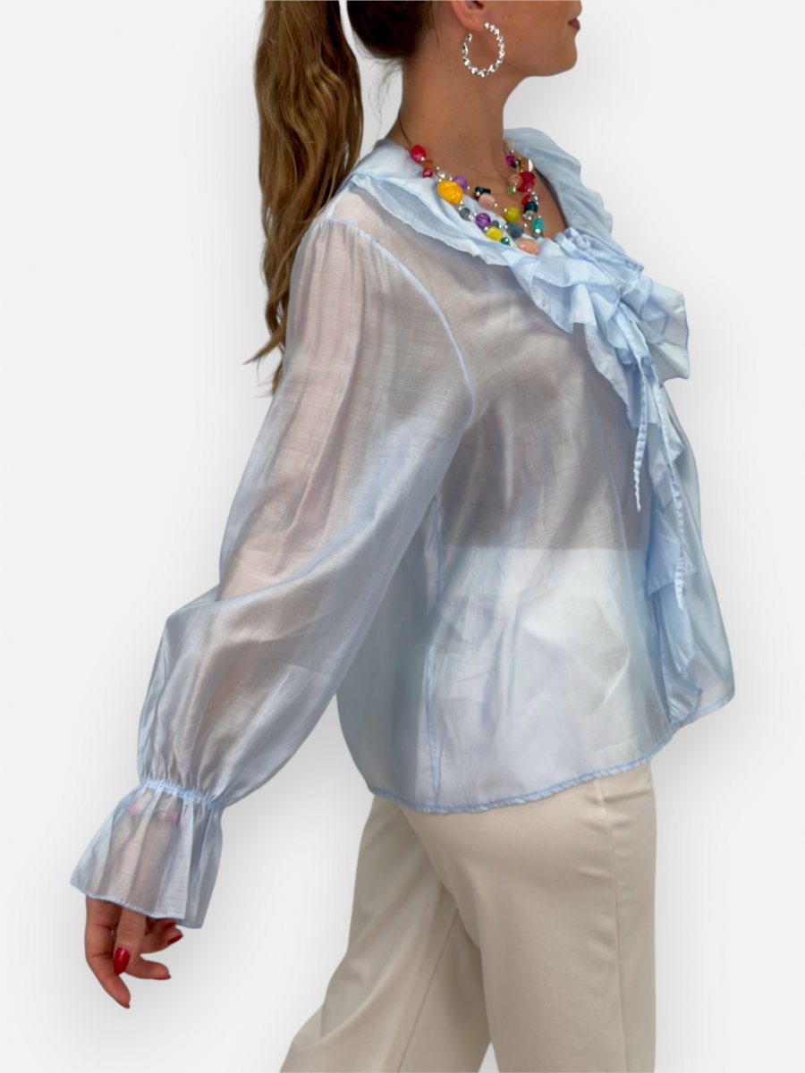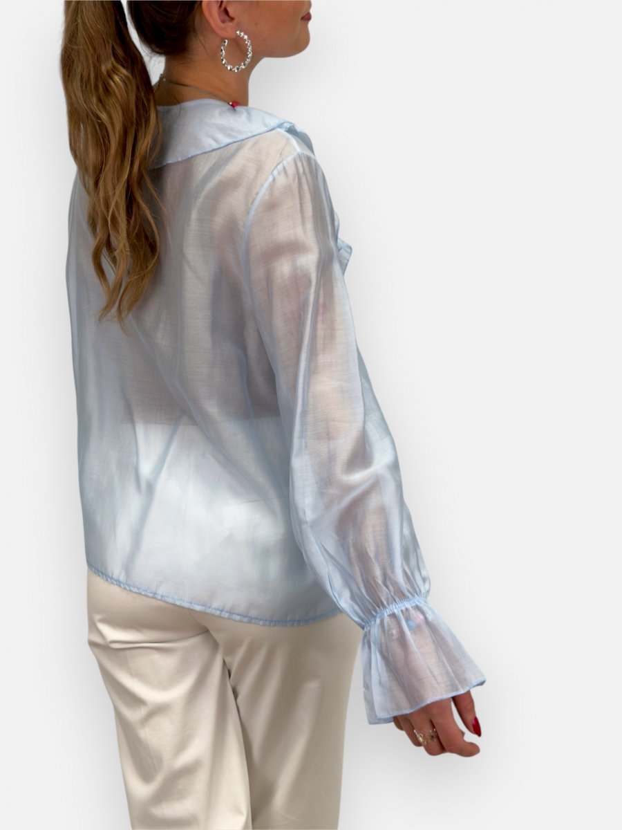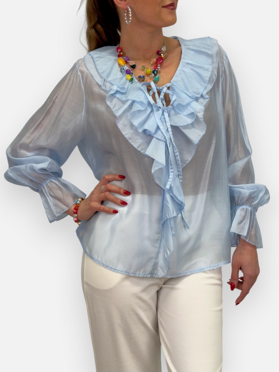 Svala är inte blygsam – hon fladdrar in och äger rummet. Den skira blusen i tencel leker med silhuetten, medan volangerna och knytningen framtill bjuder in till en liten, medveten flirt. Lätt, svepande och precis lagom avslöjande. Det här är blusen som säger “jag vet” – utan att höja rösten.