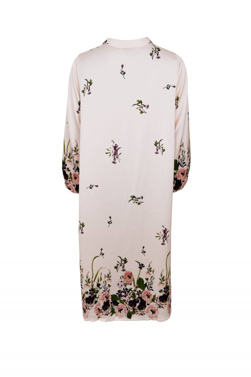 Lång blommig klänning i satin.