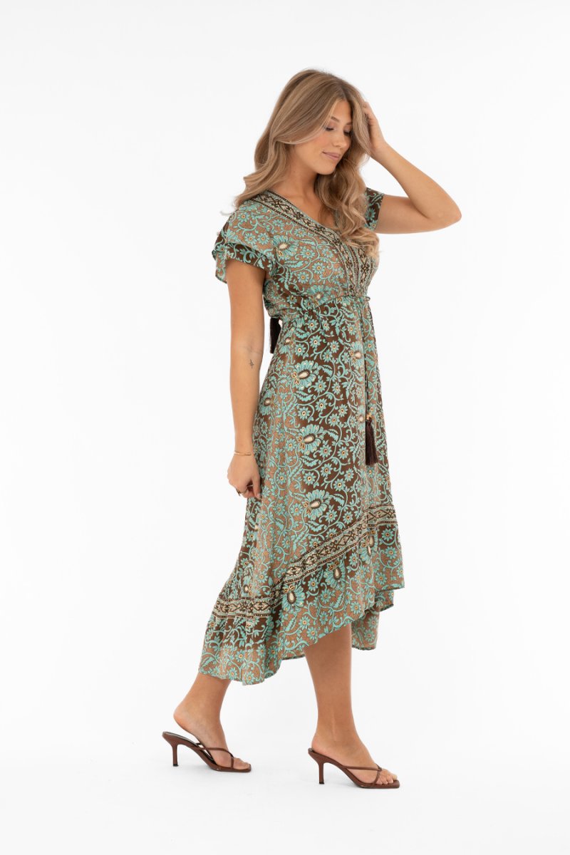 Vacker blommig klänning i bruna och turkosa toner med glittrande inslag av guld. Klänningen är v-ringad både fram och bak, där du själv kan justera bredden med knytband och toffsar i nacken. Avskärningen under bysten har knytband med toffsar fram samt mjuk resår bak för en smickrande passform. Kjoldelen är utställd och avslutas med en bred volang i nederkant, rundad och något kortare framtill för ett lekfullt uttryck. Fjärilsärmarna är gjorda i två lager med subtilt rynk på axeln, vilket ger extra volym och en elegant, feminin siluett. En romantisk och festlig klänning som passar perfekt till vardag, fest och sommarens alla tillställningar.
