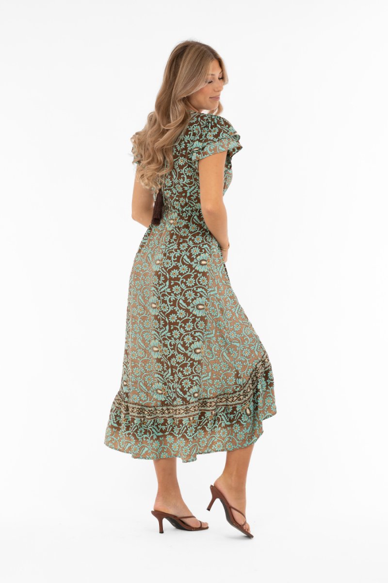 Blommig klänning i bruna och turkosa toner med guldglitter. V-ringad, volangkjol och fjärilsärm för en romantisk och feminin look.