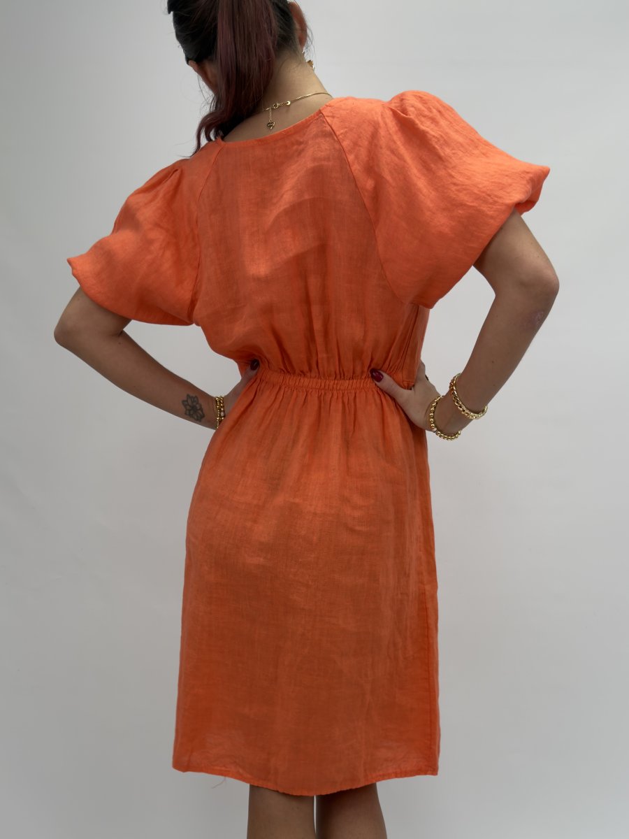 Majken är en luftig linneklänning med kort längd, v-ringning och puffiga ärmar. Rynkdetaljen framtill ger en feminin touch, medan den avslappnade passformen gör klänningen både bekväm och stilren.