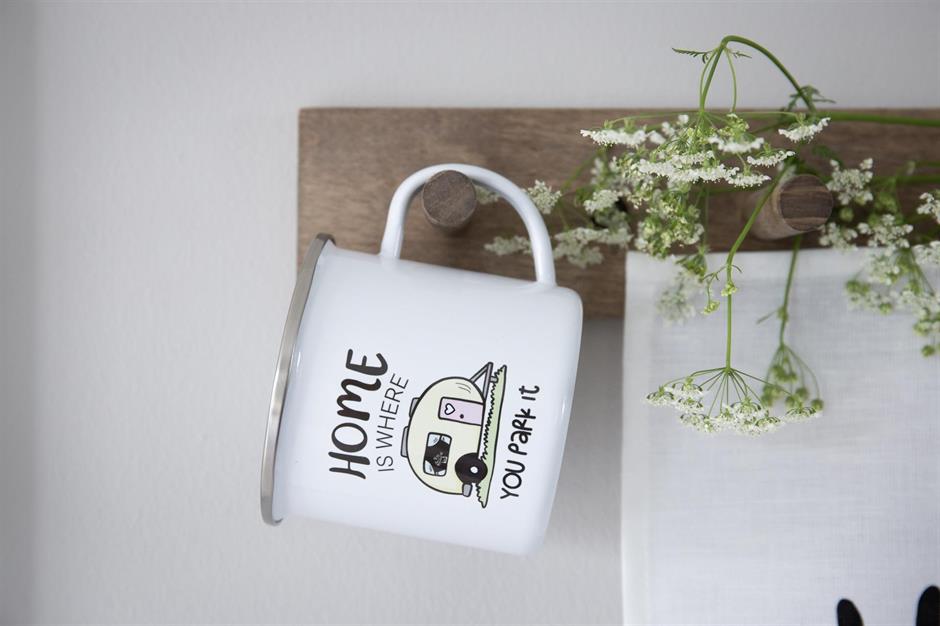 Emaljmugg, Home is/Husvagn, vit/pastell