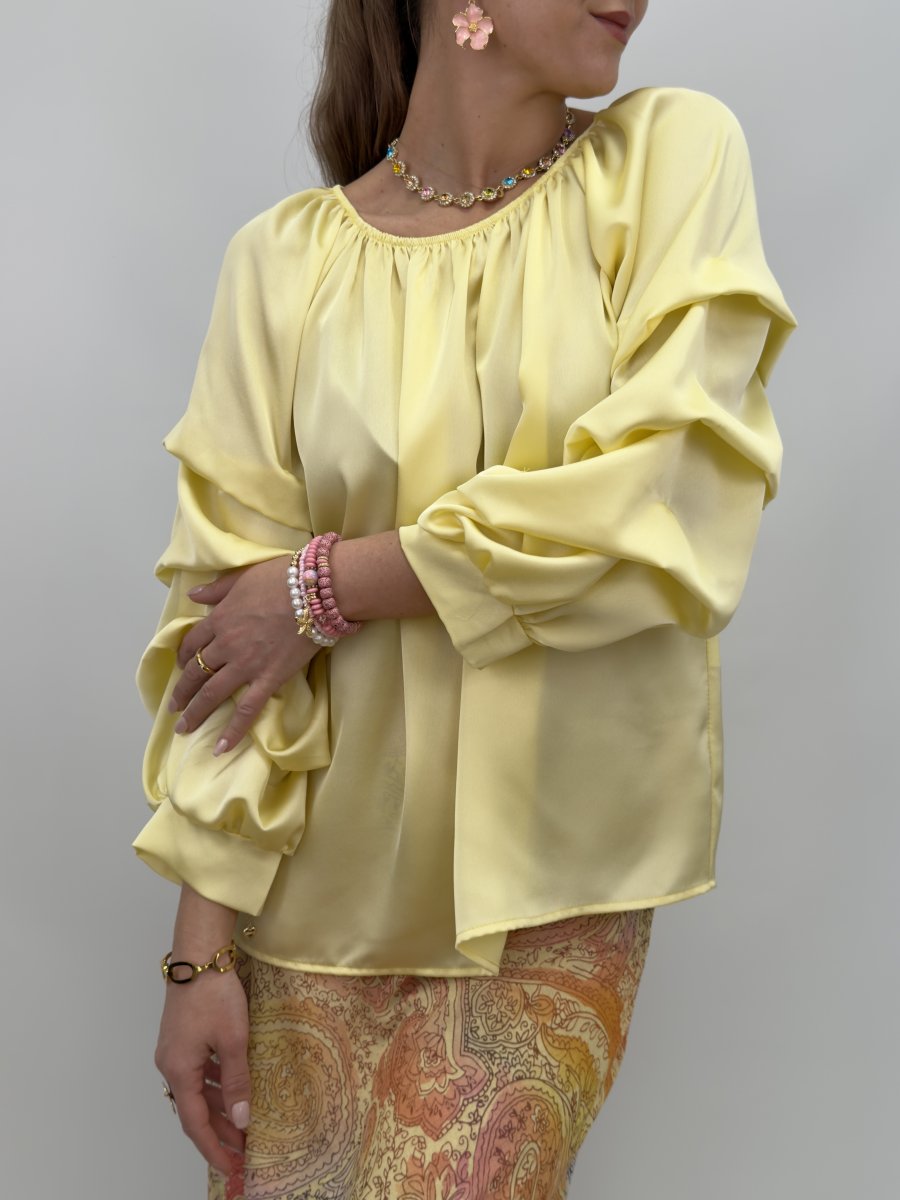 Raya är en glansig blus med vackra volymärmar som ger en sofistikerad men lekfull känsla. Perfekt för både vardag och fest, där den glänsande ytan lyfter din stil och gör varje outfit speciell.