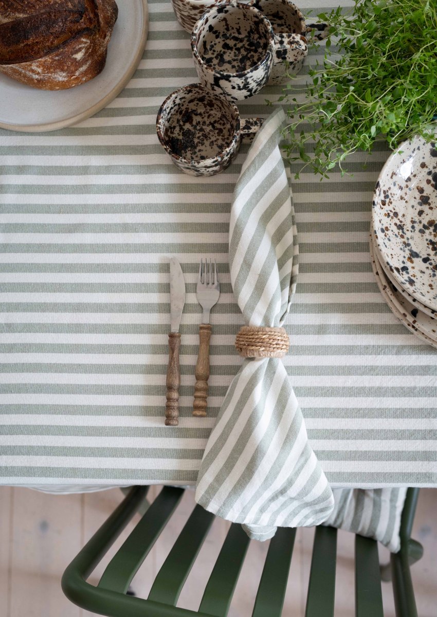 En akrylatbehandlad duk med en klassisk rand, tillverkad av återvunnen bomull och återvunnen polyester. Tyget är akrylatbehandlat och har egenskaper som liknar en vaxduk, till exempel, vattenavvisande och lätt att torka av, men har en mjukare och mer tygliknande känsla.