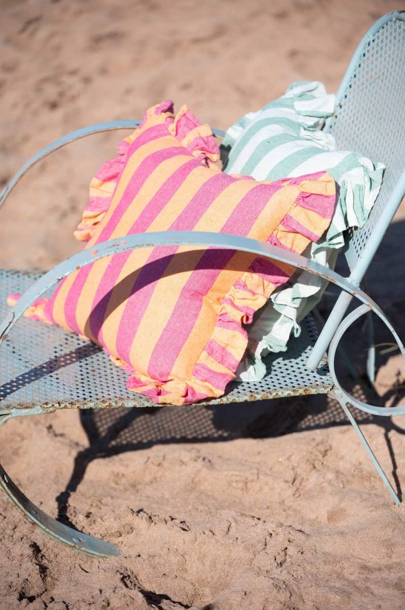 Kuddfodral i fin blockrand med en volangkant runtomkring, tillverkat av en miljövänlig blandning av återvunnna material.